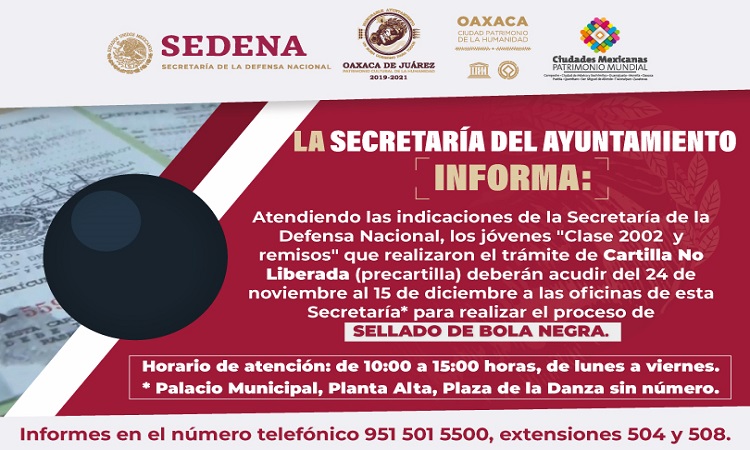El Ayuntamiento de Oaxaca de Juárez, a través de la Secretaría Ayuntamiento, solicita a los jóvenes conscriptos “Clase 2002 y remisos”, que realizaron el trámite para obtener la Cartilla No liberada (precartilla) del Servicio Militar Nacional, acudir al Palacio Municipal para obtener el sello de “Bola negra”.