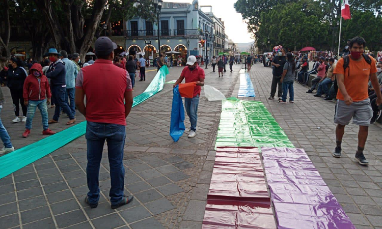 Oaxaca de Juárez. Pese a la contingencia sanitaria por COVID-19, la tarde de este lunes comerciantes ambulantes encabezados por Hugo Jarquín y Carmela Luján se repartieron espacios en el zócalo de la ciudad.