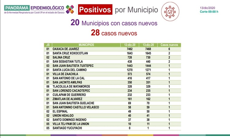 Los Servicios de Salud de Oaxaca (SSO), han contabilizado hasta este 13 de diciembre, 28 casos nuevos de COVID-19 en 20 municipios, así como lamentablemente una defunción.