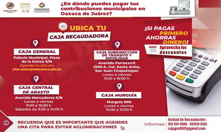 Para facilitar a la ciudadanía el pago de sus contribuciones municipales, el Ayuntamiento de Oaxaca de Juárez, a través de la Tesorería Municipal, informa que cuenta con cuatro cajas recaudadoras ubicadas en distintos puntos de la ciudad, a donde las personas podrán acudir para efectuar sus pagos correspondientes a predial, derecho de panteones y licencias de funcionamiento a través de la actualización del Padrón Fiscal, entre otros más.