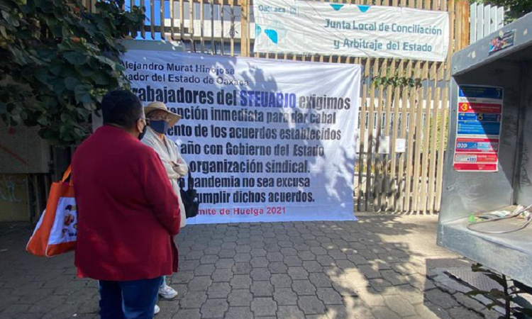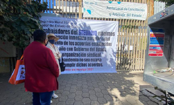 Oaxaca de Juárez. Integrantes del Sindicato de Trabajadores y Empleados de la Universidad Autónoma Benito Juárez de Oaxaca (STEUABJO) se manifestaron este viernes en la Junta de Conciliación y Arbitraje, ubicada en inmediaciones del Bulevar José Vasconcelos.