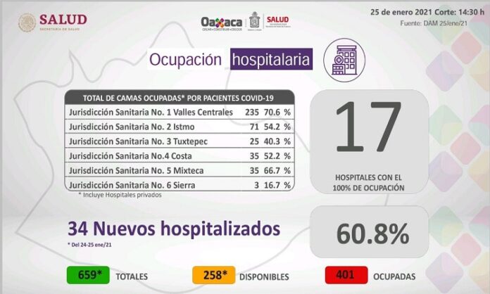 En relación a la ocupación hospitalaria, de las 659 camas disponibles, 401 camas están ocupadas lo que representa el 60.8% y se tienen disponibles 258. A la fecha hay 17 hospitales con el 100% de ocupación y 34 nuevos hospitalizados del 24 al 25 de enero.