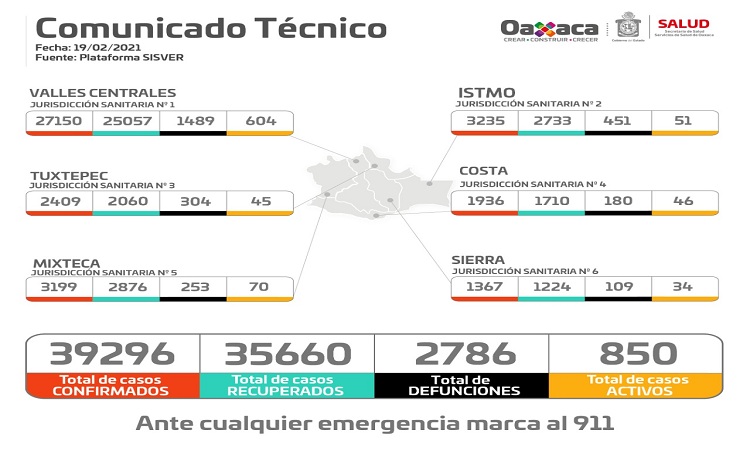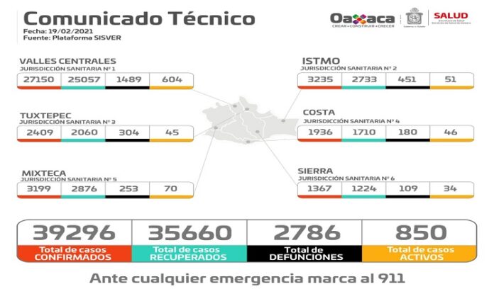 Los Servicios de Salud de Oaxaca (SSO), informan que al corte de este viernes 19 de febrero, se han registrado 276 casos nuevos de COVID-19, que suman 39 mil 296 acumulados en la entidad.
