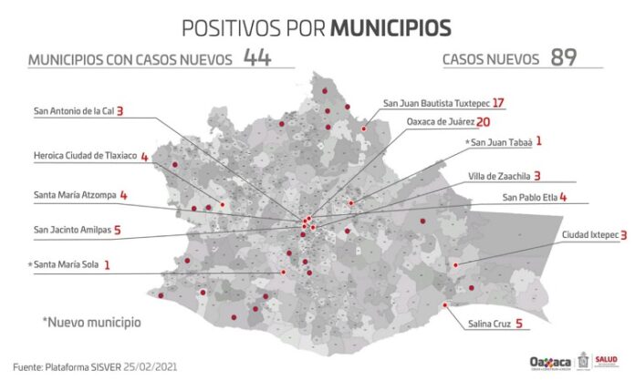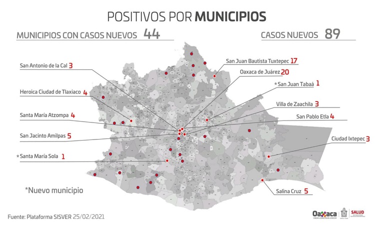 Al corte epidemiológico de este jueves 25 de febrero, los Servicios de Salud de Oaxaca (SSO) tienen registrados 89 casos nuevos de COVID-19, distribuidos en 44 municipios, sumando 40 mil 152 acumulados, hay 13 nuevas defunciones que contabilizan dos mil 873 acumuladas.