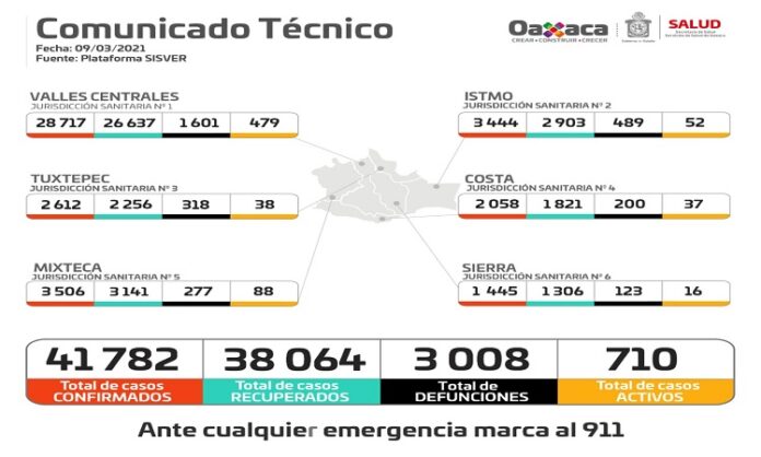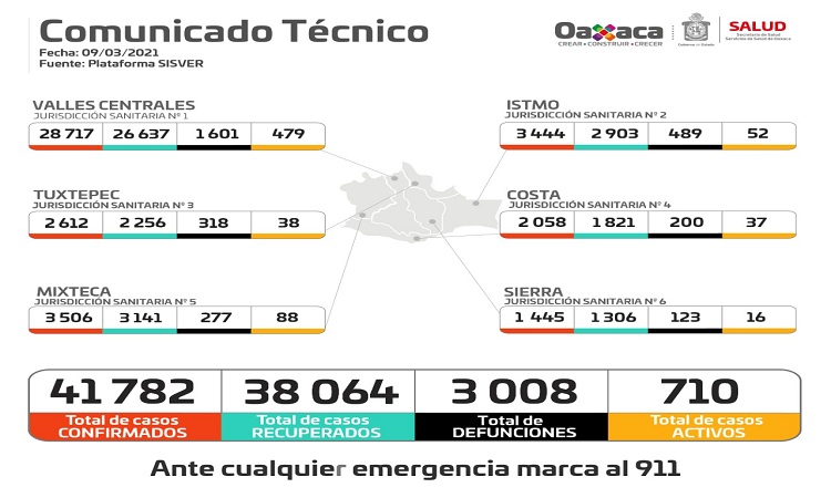 Informó que la Jurisdicción Sanitaria número uno Valles Centrales registra 28 mil 717 casos confirmados y mil 601 defunciones, Istmo tres mil 444 y 489 decesos, Tuxtepec dos mil 612 y 318 muertes, Costa dos mil 058 y 200 pérdidas humanas, Mixteca tres mil 506 y 277 fallecimientos y la Sierra mil 445 y 123 defunciones.