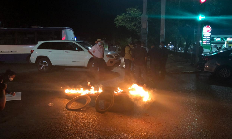 Los inconformes instalaron un bloqueo en la carretera federal 190 frente al columpio de Ixcotel para demandar a los servicios de salud la aplicación de la vacuna contra COVID-19.