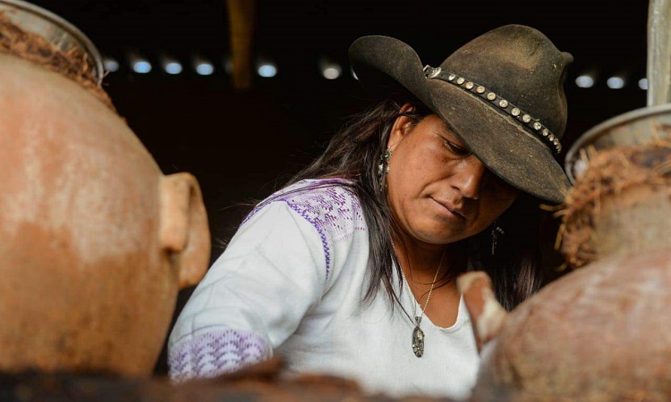 Aunque la elaboración del mezcal pareciera ser un trabajo sólo para hombres, hay mujeres que se suman a las cifras de producción. Sósima Olivera es promotora de la Cooperativa de Mezcaleros Chontales Tres Colibrí que integran nueve familias de su comunidad y produce la marca Fane Kantsini en las presentaciones Coyote, Barril, Arroqueño y Tobalá.