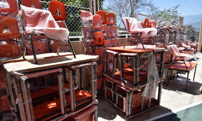 Tanto en la Cañada como en la Costa se distribuyeron mesas, sillas, pizarrones, equipos de sonido, computadoras, archiveros, impresoras, escritorios, botes de pintura, instrumentos de banda de guerra y paquetes de material de aseo, deportivo y de oficina.