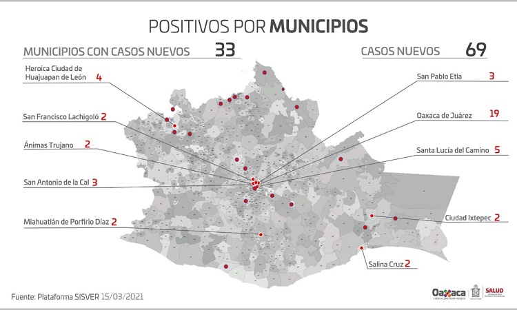 Especificó que los 69 casos nuevos se ubican en 33 municipios, destacando Oaxaca de Juárez con 19, Santa Lucía del Camino con cinco, Heroica Ciudad de Huajuapan de León con cuatro, así como San Antonio de la Cal y San Pablo Etla con tres, respectivamente, el resto dos y uno.