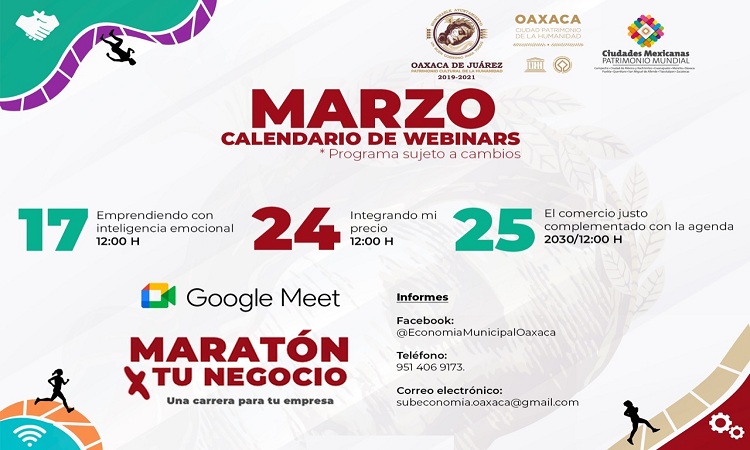 Explorando acciones y herramientas para impulsar la competitividad del sector emprendedor y empresarial de la ciudad capital, el Ayuntamiento de Oaxaca de Juárez, a través de la Dirección de Economía, invita a la ciudadanía a participar en las charlas y talleres que son parte del programa de formación empresarial y fomento emprendedor “Maratón x tu negocio”, los días 17, 24 y 25 de marzo, mediante registro previo en el enlace bit.ly/3eHWDf1.