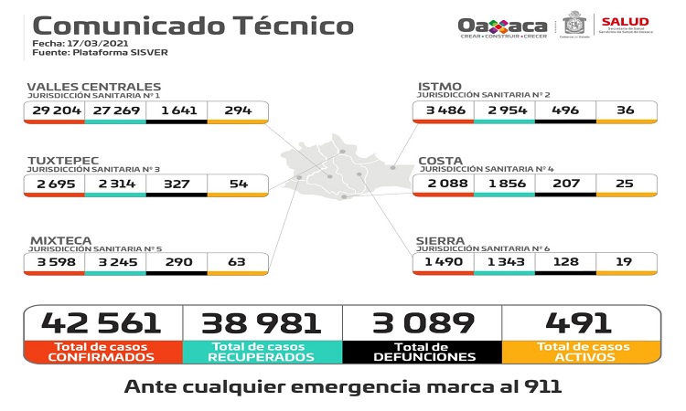 La jefa del departamento de Promoción a la Salud de los Servicios de Salud de Oaxaca (SSO), Martha Fabiola Medina Casas, informó que se registraron 163 contagios de COVID-19 este 17 de marzo, para acumular 42 mil 561 casos confirmados en la entidad, además de 14 decesos; por lo que el global de fallecimientos llegó a los tres mil 089.