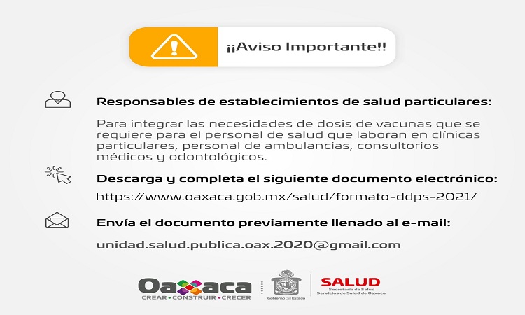A fin de iniciar la aplicación de la vacuna contra el COVID-19 en el personal de salud de la iniciativa privada, los Servicios de Salud de Oaxaca (SSO) hace un llamado a los responsables de establecimientos de salud particulares a registrarse en el censo estatal.