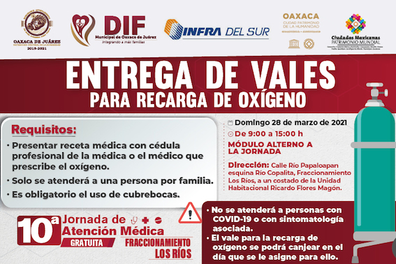 Para apoyar a más familias que han sufrido el embate de la pandemia, el Ayuntamiento de Oaxaca de Juárez hará entrega nuevamente de vales para la recarga gratuita de tanques de oxígeno medicinal durante la Décima Jornada de Atención Médica Gratuita, a realizarse el próximo domingo 28 de marzo en el Parque del Fraccionamiento Los Ríos, que se ubica en la intersección de las calles Río Papaloapan y Río Copalita.
