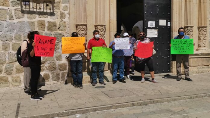 Oaxaca de Juárez. Ex trabajadores indirectos de diversas áreas del municipio de Oaxaca de Juárez, se manifestaron este día en el palacio municipal para denunciar despidos injustificados y falta de pagos.