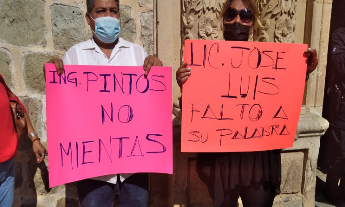 Oaxaca de Juárez. Ex trabajadores de Obras Públicas del Municipio de Oaxaca de Juárez, se manifestaron este martes en las afueras del Palacio Municipal ante la falta de pagos.
