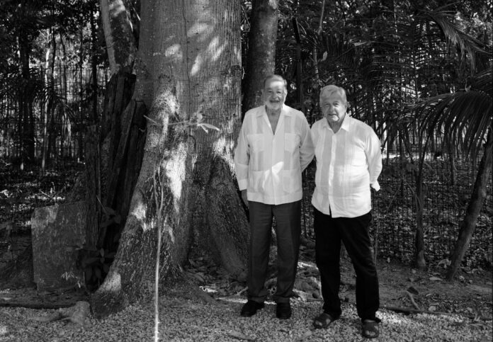 El presidente Andrés Manuel López Obrador se reunió este sábado con el empresario Carlos Slim, como parte de la evaluación de las obras del Tren Maya. Una de las compañías del magnate participa en un tramo del proyecto.