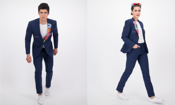 Dicho artesanal oaxaqueño tiene en la solapa del saco un bordado realizado a mano por mujeres del Istmo de Tehuantepec, con colorido destacado en un traje confeccionado con tejido de alta calidad dry-fit.