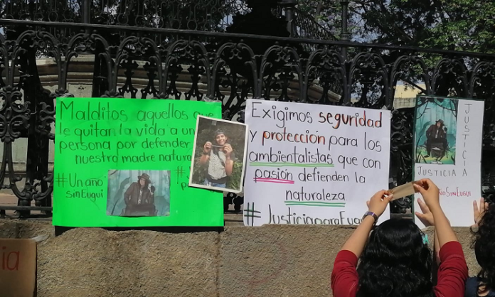 Oaxaca de Juárez. A un año de su asesinato, un grupo de activistas se manifestaron este viernes en el zócalo de la ciudad de Oaxaca para demandar justicia para el biólogo, estudiante y defensor del medio ambiente, Eugui Roy Martínez Pérez.