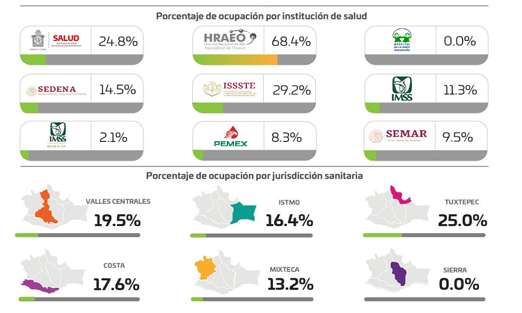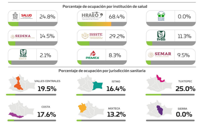 Señaló que este martes son cuatro los nosocomios que se encuentra 100% de saturación médica. Por Jurisdicción Sanitaria: Valles Centrales registra el 19.5%, Istmo 16.4%, Tuxtepec 25%, Costa 17.6%, Mixteca 13.2% y la Sierra no presenta pacientes hospitalizados.