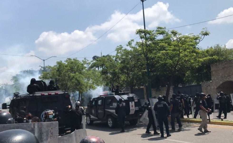 Esta es la segunda ocasión, en lo que va del mes, que estudiantes normalistas -quienes piden examen de admisión presencial y por escrito, y la liberación de 19 de sus compañeros detenidos y acusados de los delitos de motín, atentados contra la paz, robó y pandillerismo-, fueron reprimidos por cuerpos policiacos, quienes les lanzaron gas lacrimógeno y los persiguieron hasta las instalaciones de su escuela, en donde los acorralaron.