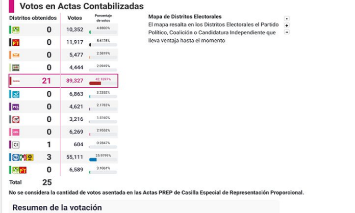 Sin embargo, según datos del PREP, en al menos dos distritos podría revertirse el triunfo; en uno a MORENA y en otro a la coalición opositora; en ambos casos, por la diferencia porcentual entre el primer lugar y el segundo, habría recuento total de votos.