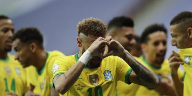 Marquinhos aprovechó un balón que le quedó inesperadamente en las piernas en el primer tiempo, mientras que Neymar convirtió un penal en el complemento y “Gabigol” Barbosa hizo el tercero en la agonía por Brasil, que se coronó en 2019 como anfitrión el certamen y busca revalidar el título, nuevamente como local.