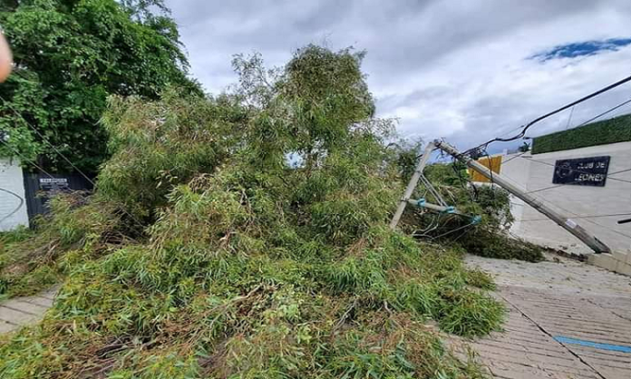 Pese a que este día no se registraron lluvias ni fuertes vientos, se reportó la caída de un laurel en la calle Neptuno de la colonia Estrella y que derribó postes de energía eléctrica y de telefonía.