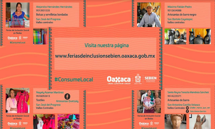 De esta manera, los que integran parte del sector artesanal y pequeños productores, contarán con un espacio virtual para la venta de sus productos de manera gratuita, quienes además de contar con la promoción de sus productos en las redes sociales de la Sebien, tendrán acceso a un catálogo digital a través de la plataforma sebienferiasdeinclusionsocial@oaxaca.gob.mx, donde podrán mostrar sus productos junto con una gran variedad de artículos de todas las regiones del estado.