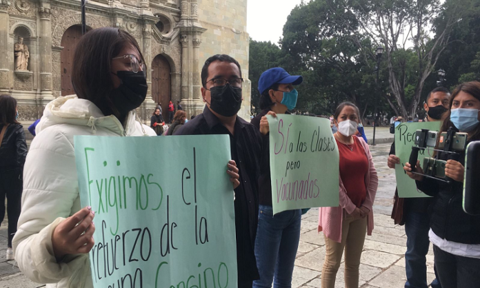 Oaxaca de Juárez. Integrantes de la autodenominada Antorcha Magisterial, demandaron al gobierno federal y estatal agilizar el plan de vacunación en Oaxaca, ante el regreso a clases presenciales.