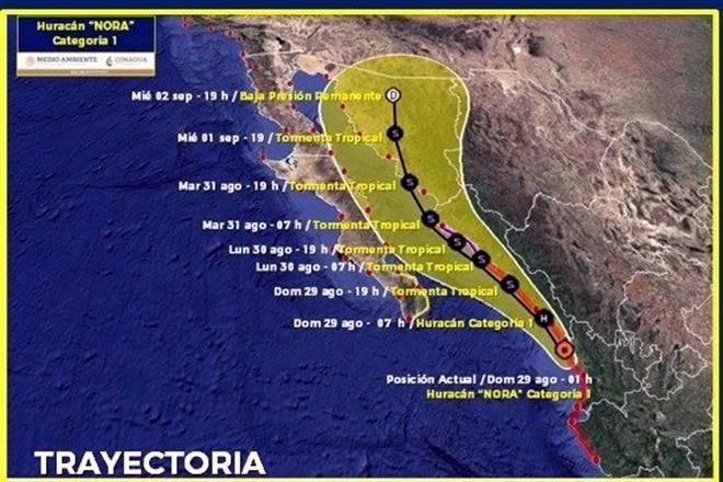 De acuerdo a la trayectoria prevista para “Nora”, se espera que a las 19:00 horas de este domingo se degrade a tormenta tropical, y que impacte en Sonora el 31 de agosto.