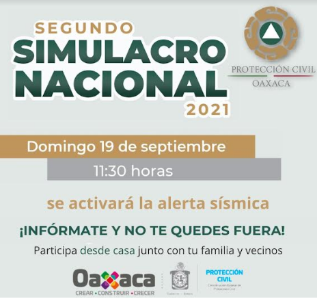 El Gobierno del Estado a través de la Coordinación Estatal de Protección Civil de Oaxaca (CEPCO), hace la invitación a la población oaxaqueña, dependencias del gobierno federal, estatal y municipal a participar en el Segundo Simulacro Nacional que se efectuará el 19 de septiembre en punto de las 11:30 horas, activándose las sirenas del Sistema de Alerta Sísmica de Oaxaca (SASO), en esta ciudad capital y municipios conurbados.