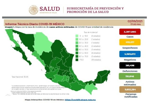 De acuerdo con el Comunicado Técnico Diario de la Secretaría de Salud, los casos estimados son 3 millones 597,450 y las personas recuperadas de la enfermedad se calculan en 2 millones 727,659.