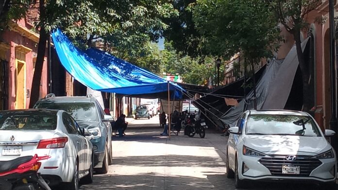 Oaxaca de Juárez. Por segundo día consecutivo, Trabajadores agrupados en la Coordinadora de Sindicatos de Salud del estado e integrantes de Antorcha Campesina cumplieron dos días de plantón sobre la calle de Pino Suárez, frente a Casa Oficial.
