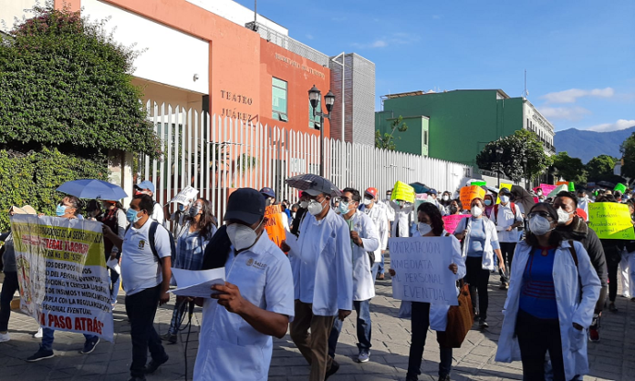 Oaxaca de Juárez. La mañana de este viernes, integrantes de la Jurisdicción 06 de la Sierra adheridos a la Sección 35 del Sindicato Nacional de Trabajadores de la Secretaría de Salud (SNTSA), marcharon una vez más en la ciudad de Oaxaca para exigir atención a sus demandas.