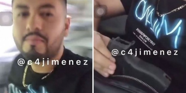 A través de un video se ve al sujeto de playera negra, con letras azules, cuando muestra dentro de una mochila el arma.