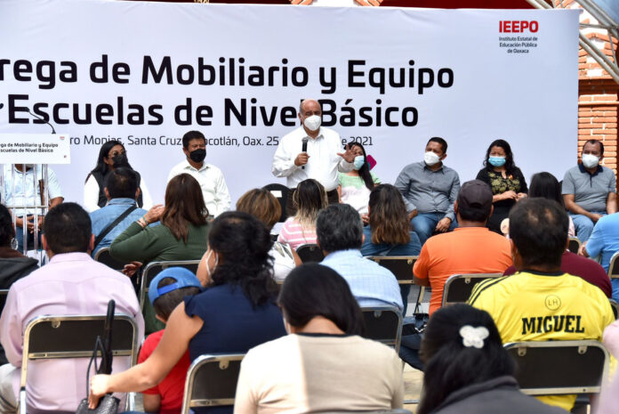 En el trabajo en equipo por la educación con autoridades municipales actuales y electas, madres, padres de familia y representantes populares, el director general del Instituto Estatal de Educación Pública de Oaxaca (IEEPO), Francisco Ángel Villarreal, continuó los recorridos de capacitación al magisterio y entrega de mobiliario y equipo a 30 escuelas del Valle Central, en beneficio de 5 mil 798 estudiantes.