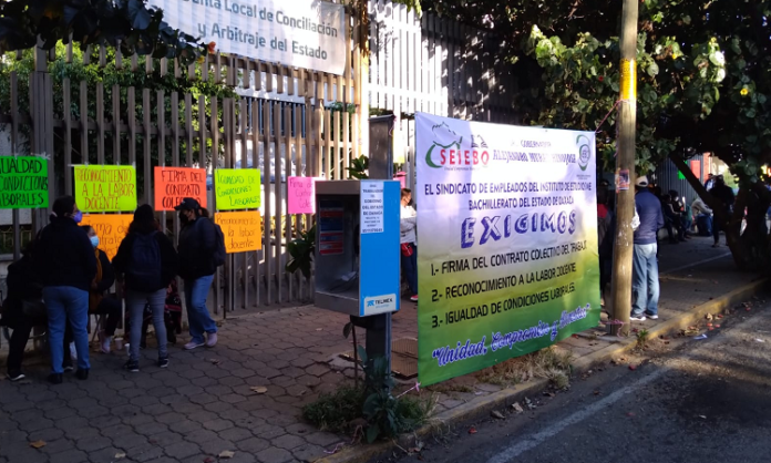 Oaxaca de Juárez. Integrantes del Sindicato de Empleados del Instituto de estudios de Bachillerato del Estado de Oaxaca (SEIEBO), protestaron este lunes en sus oficinas ubicadas en avenida Universidad.