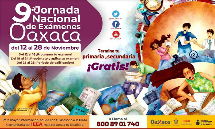El Instituto Estatal de Educación para Adultos (IEEA) de Oaxaca, invita a las y los jóvenes mayores de 15 años y a personas adultas, a terminar su educación primaria o secundaria en la próxima Jornada Nacional de Aplicación de Exámenes a realizarse en las 26 Coordinaciones de Zona ubicadas en las ocho regiones del estado, del viernes 12 al domingo 28 de noviembre.
