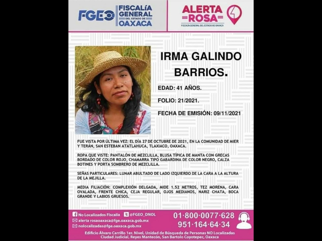 El senador de Morena, Salomón Jara exigió a la Fiscalía General del Estado de Oaxaca emprender todas las acciones necesarias para localizar con vida a la activista Irma Galindo Barrios, quien se encuentra desaparecida desde el 27 de octubre pasado y cuya vida se teme esté en riesgo debido a su lucha contra la tala ilegal de los bosques oaxaqueños.