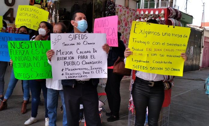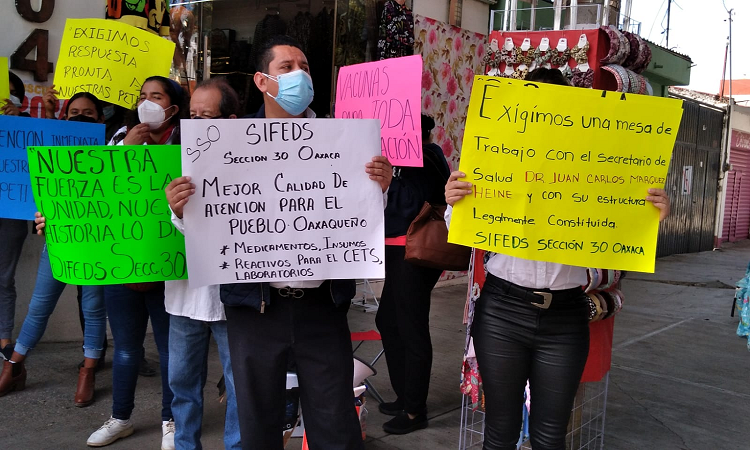 Oaxaca de Juárez. Integrantes de la Sección 30 del Sindicato Federal Democrático de Salud (Sifeds), bloquearon este viernes las oficinas alternas de los Servicios de Salud de Oaxaca (SSO) ubicadas en la avenida Escuela Naval Militar, de la colonia Reforma.