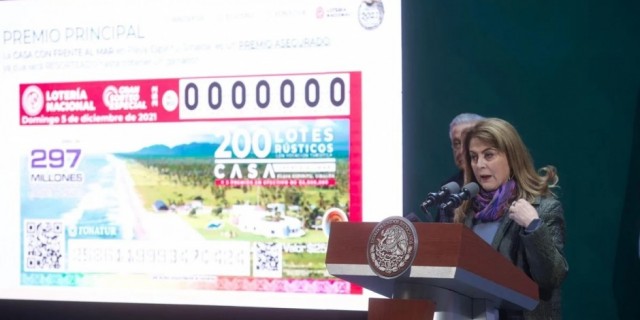 La directora general de la Lotería Nacional detalló que “el premio principal es una casa frente al mar, en Playa Espíritu Sinaloa, con un valor de 28 millones 956 mil, el segundo premio en efectivo es de 5 millones de pesos, el tercer premio en efectivo de 5 millones de pesos, el cuarto premio en efectivo de 5 millones de pesos”.