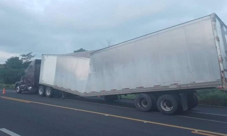Se informó que la unidad de motor, sufrió una avería en su remolque que se dobló a la mitad.