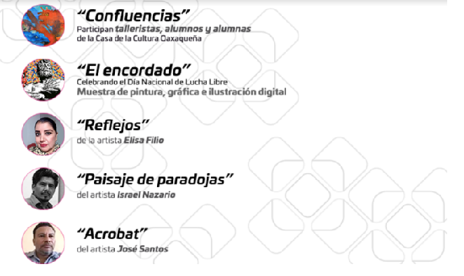 La pared virtual de la CCO también ha enriquecido su acervo digital con la obra de los artistas Rosendo Vega, Siegrid Wiese, Elisa Filio, Israel Nazario, José Santos, Spencer Farías, Aarón Zoé, Rosalba González Gallo y Sergio Spíndola. Asimismo el artista Shinzaburo Takeda quien, a sus 87 años años, realizó su primera exposición virtual en la Casa de la Cultura Oaxaqueña.