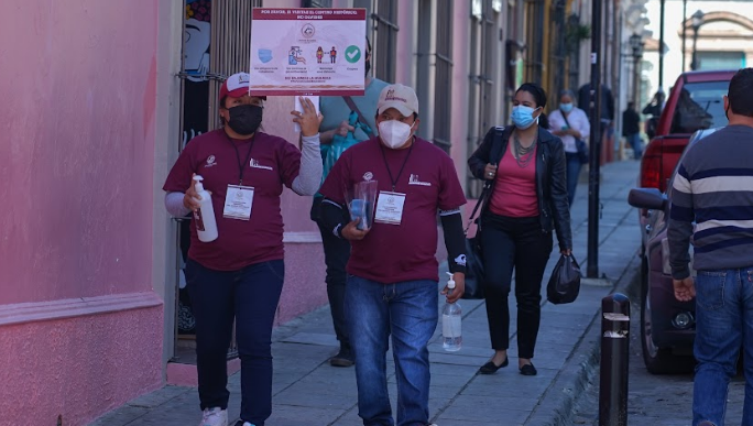 Ante los riesgos de contagio por el virus SARS-COV 2 (Covid-19), el edil capitalino instruyó a la coordinadora Ejecutiva del Centro Histórico, Alicia Bueno Velasco, a instalar cuadrillas que promuevan, en los turistas y en la ciudadanía oaxaqueña, el uso correcto del cubrebocas. Estos grupos de jóvenes estarán trabajando los días jueves, viernes y sábado, por ser los días de mayor afluencia, en un horario de 10:00 a 17:00, recorriendo las calles del Centro Histórico.