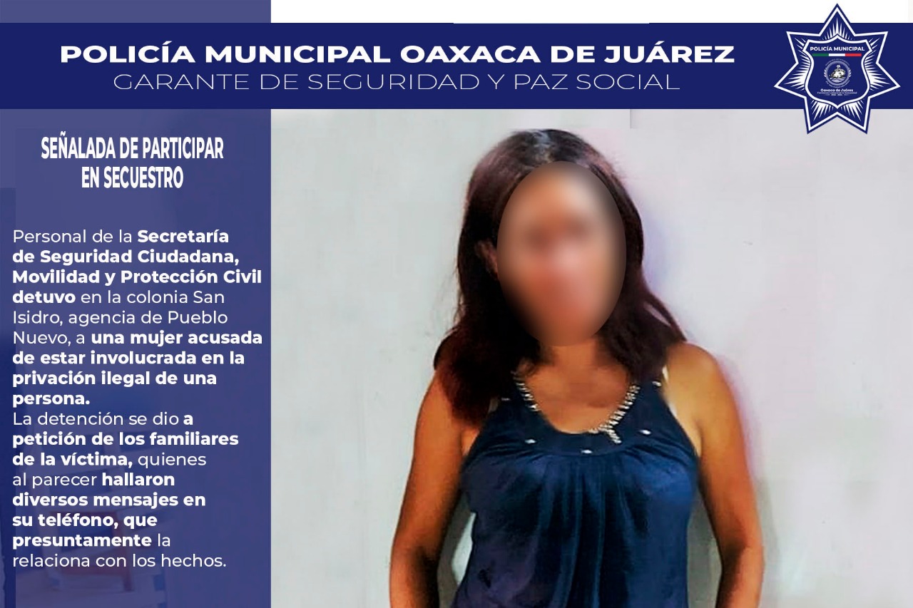 Haciendo efectivo el planteamiento del edil capitalino, Francisco Martínez Neri, de fortalecer la seguridad en el municipio de Oaxaca de Juárez, la Secretaría de Seguridad Pública, Vialidad y Protección Ciudadana, responde de manera inmediata y efectiva a los llamados de la ciudadanía oaxaqueña, tal y como aconteció el pasado miércoles 26 de enero al realizar la detención de una mujer, presuntamente involucrada en la privación ilegal de una persona, al ser señalada directamente por los familiares de la víctima.