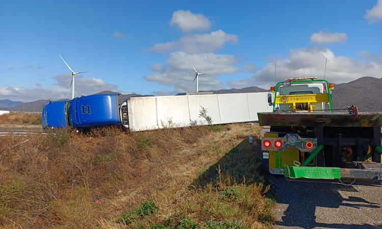 Oaxaca de Juárez. Debido a los fuertes vientos registrados en la región del Istmo de Tehuanetepec, la tarde de este jueves un tráiler se volcó sobre la carretera federal 190.