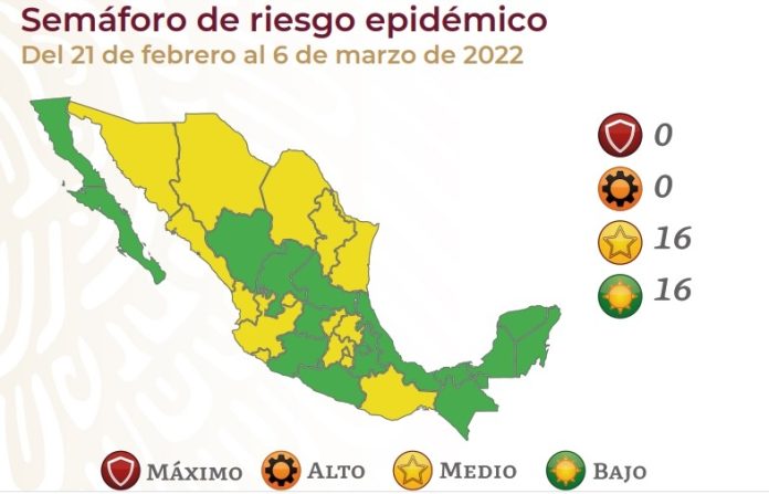 Según el semáforo que estára vigente del 21 de febrero al 6 de marzo y que fue publicado este viernes, en amarillo, o riesgo medio, estarán la Ciudad de México, el Estado de México, Sonora, Chihuahua, Coahuila, Nuevo León, Tamaulipas, Sinaloa, Nayarit, Jalisco, Colima, Aguascalientes, Querétaro, Hidalgo, Morelos y Oaxaca.