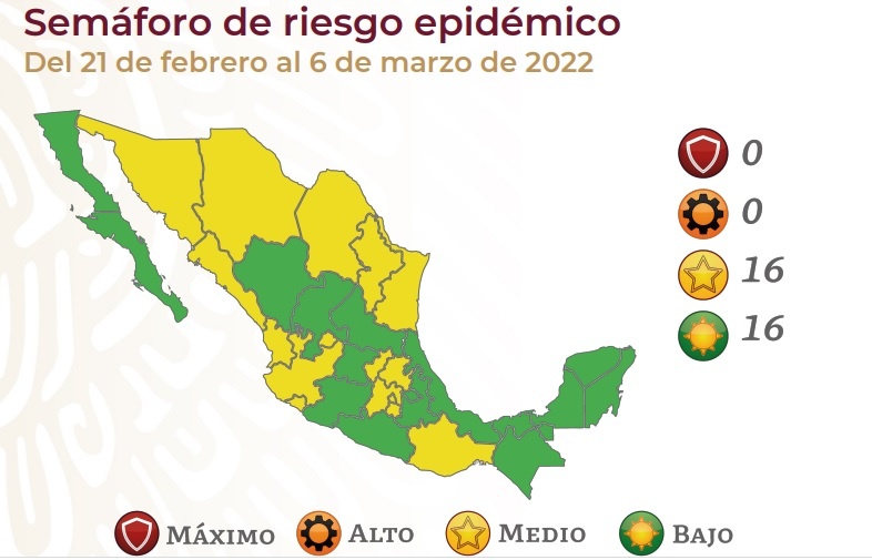 En verde, o riesgo bajo, se ubicarán Baja California, Baja California Sur, Durango, Zacatecas, San Luis Potosí, Veracruz, Guanajuato, Michoacán, Guerrero, Tlaxcala, Puebla, Tabasco, Chiapas, Yucatán, Campeche y Quintana Roo.