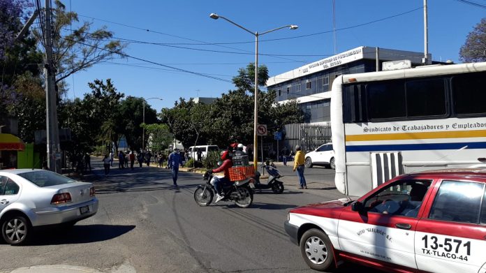Los trabajadores utilizaron varias unidades de motor para impedir el paso vehicular a la altura de la Junta Local de Conciliación y Arbitraje de Oaxaca (JLCyA).
