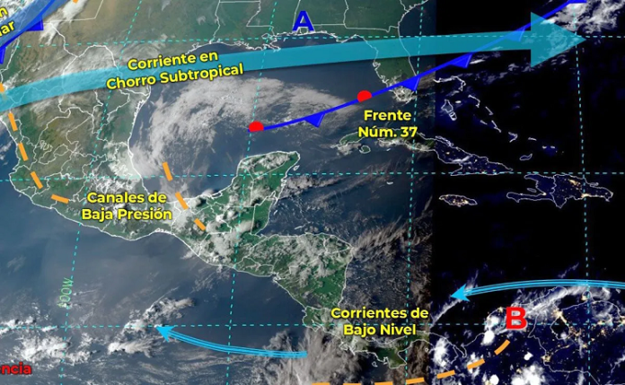 Durante este día, el frente frío Núm. 38 se desplazará sobre el noreste y oriente de la República mexicana, originando lluvias y chubascos que podrían acompañarse de descargas eléctricas en zonas de Veracruz y Puebla. Asimismo, la masa de aire frío que impulsa al frente será reforzada e interaccionará con las corrientes en chorro polar y la subtropical, manteniendo el ambiente frío a muy frío con heladas al amanecer en el norte del país, siendo el ambiente gélido en zonas altas de Chihuahua y Durango. Además, ocasionarán fuertes rachas de viento con probabilidad de tolvaneras en el noroeste, norte y noreste del territorio nacional, así como, viento de componente norte por la tarde en el litoral de Tamaulipas y Veracruz. Por otro lado, un canal de baja presión en el sureste de México y la entrada de humedad del Golfo de México y Mar Caribe, provocarán lluvias y chubascos en dicha región, además de la Península de Yucatán. Por su parte, continuará ambiente vespertino de caluroso a muy caluroso en gran parte del territorio nacional y viento de componente sur con rachas de fuertes a muy fuertes en Veracruz, Tabasco, Istmo y Golfo de Tehuantepec, además de la Península de Yucatán.